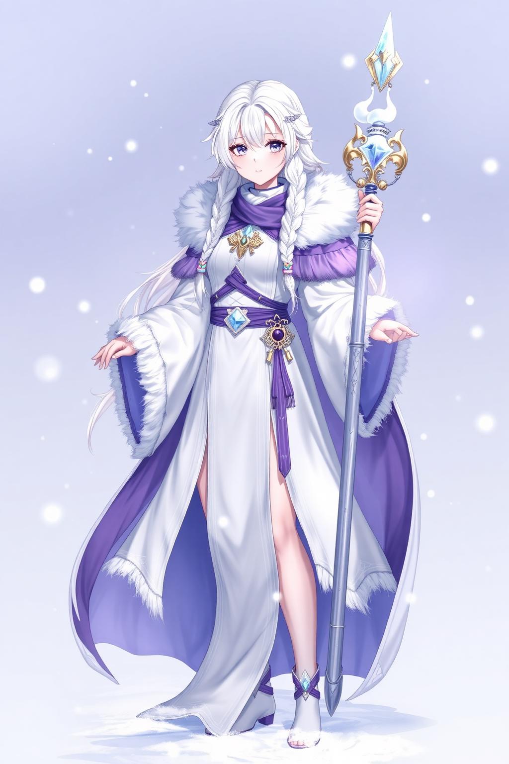 Prêtresse du temple d'Aelvarn, Sélène veille sur les rituels d'hiver. Son sceptre cristallin invoque la lumière polaire elle-même.